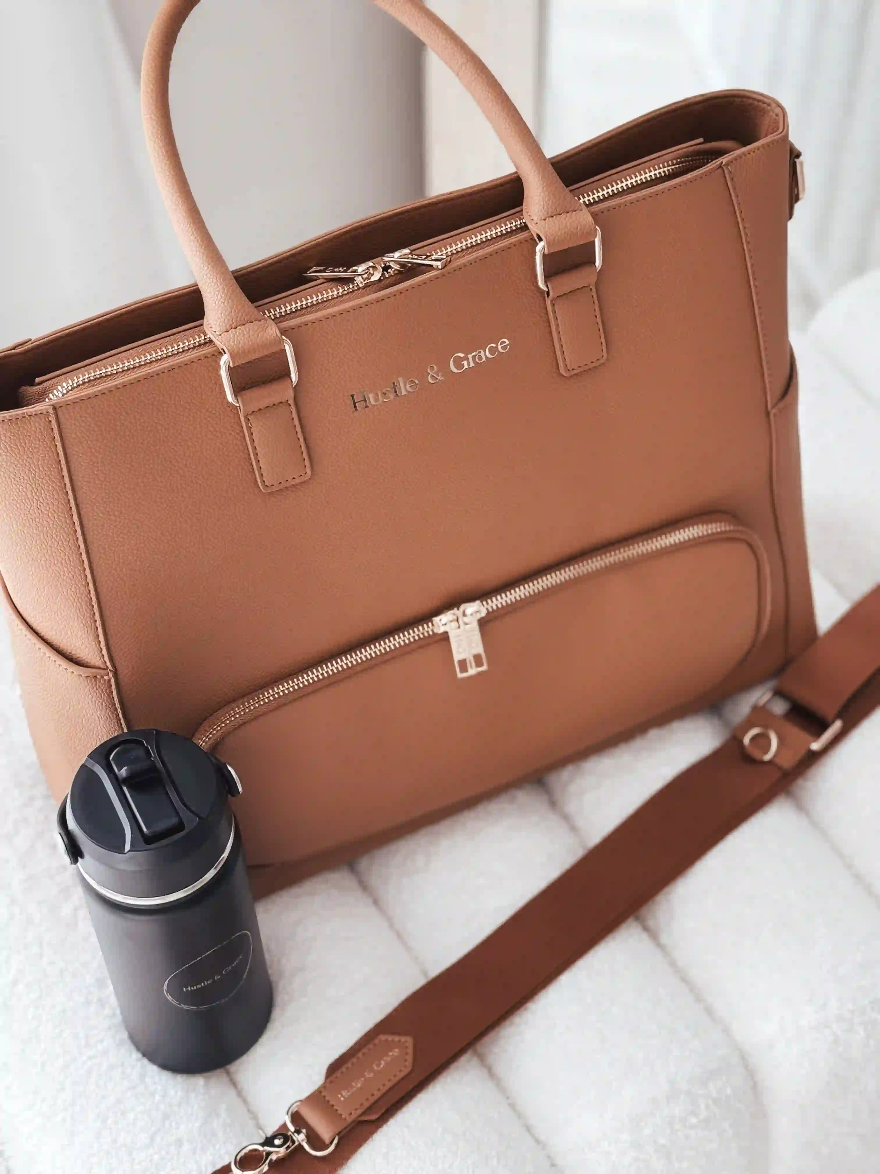 Say goodbye to your old laptop bag,  The Ultimate Travel Tote carries your laptop, snacks, and bottle while still looking airport-polished.